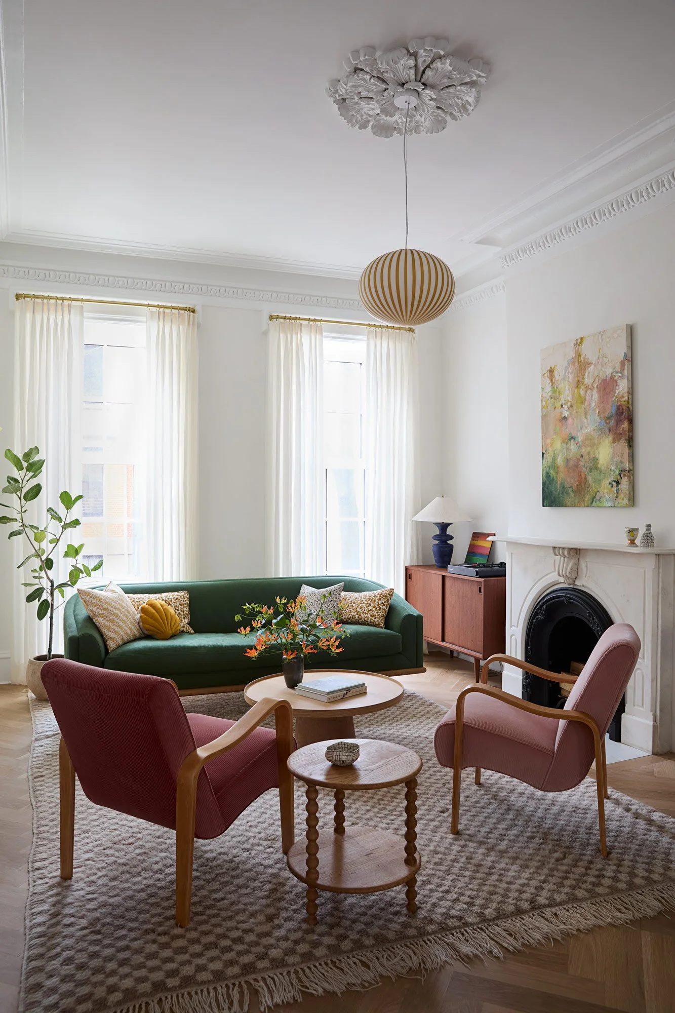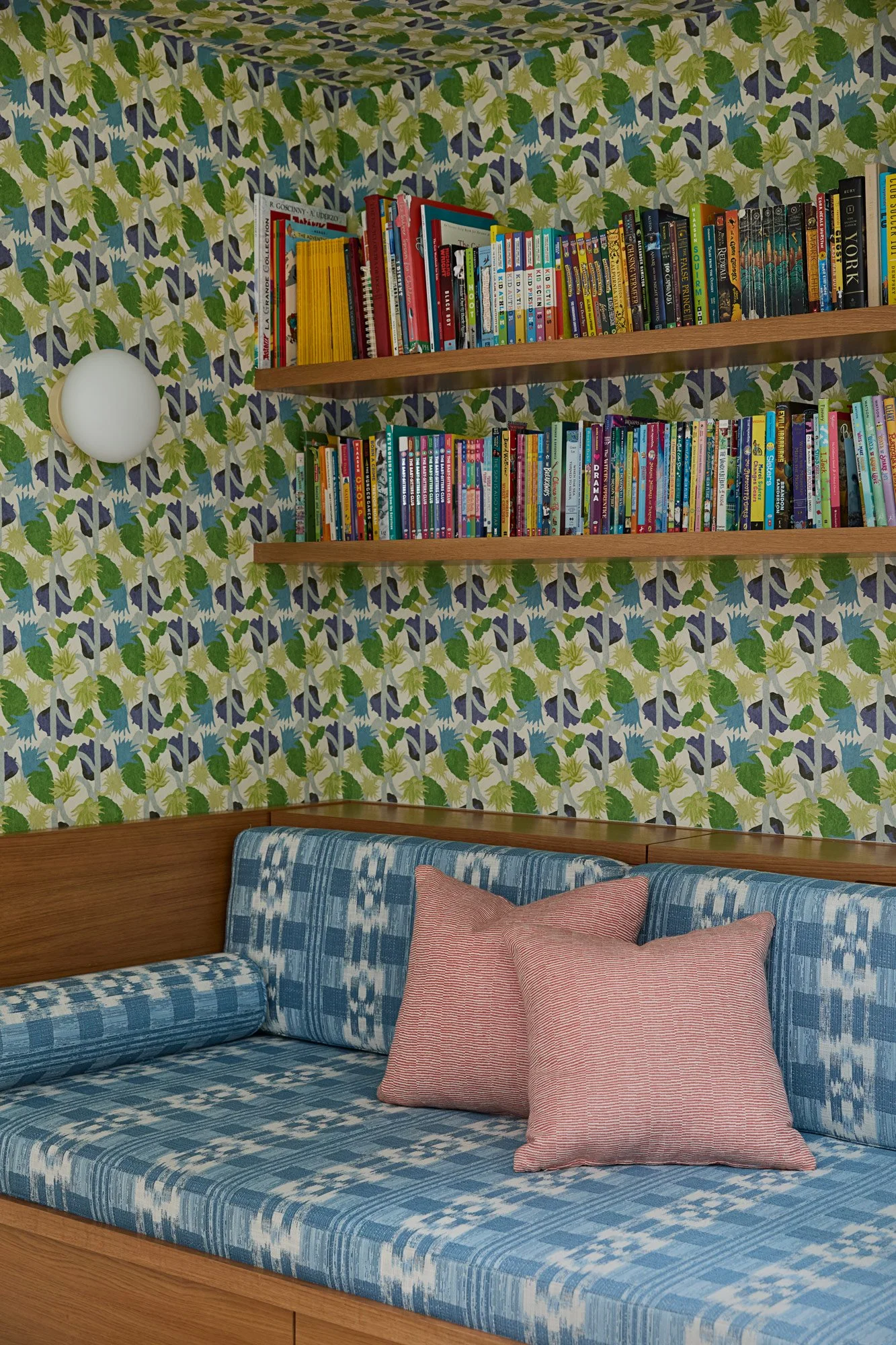 Together with Ingui Architecture, a complete gut renovation of a six story landmarked brownstone from 1895 in the most coveted neighborhood of Cobble Hill, Brooklyn. After many decades of being a multiple family dwelling, the house was thoughtfully reimagined as a comfortable single-family home with a high-performance retrofit using Passive House construction and technology. The house is vibrant with fluid flow between public and private spaces. The garden level is built for teenagers and grandparents alike, with a separate kitchen and guest living space and a comfortable gaming room and mudroom for sports equipment. The parlor floor is generous comprising an open living room, dining room and kitchen with expansive new windows and doors overlooking the back deck and garden. White oak millwork in the kitchen and new white oak chevron flooring throughout create a warm, welcoming environment. A custom upholstered sofa from Nickey Kehoe and a pair of vintage Thonet bentwood chairs sit atop a custom check rug from Morocco. A modern heirloom dining table from Pinch is surrounded by vintage chairs upholstered in Josef Frank. Lighting from Beata Heuman, Urban Electric and In Common With adds color and texture from the soaring ceilings. Moroccan zellige tile is combined with marbleized wallpaper in the powder room and classic American modern tile from Heath defines the guest kitchen, mudroom and primary bathroom suite. The kid’s bathrooms are lined with bold, playful checked and striped cement tiles. The serene sleeping quarters feature plush, new and vintage rugs and a mix of modern classic furniture and custom headboards and window treatments. There is a combined home office, den and gym on the floor of the primary suite. The girls wanted bold, floral wallpapers in their rooms. My favorite space is the communal area on the children’s floor where we created the coziest, but still massive, 11-foot reading nook upholstered in performance fabric and wallpaper. The top floor loft provides abundant work and craft space for the kids and their friends and a big comfortable couch for movie nights.