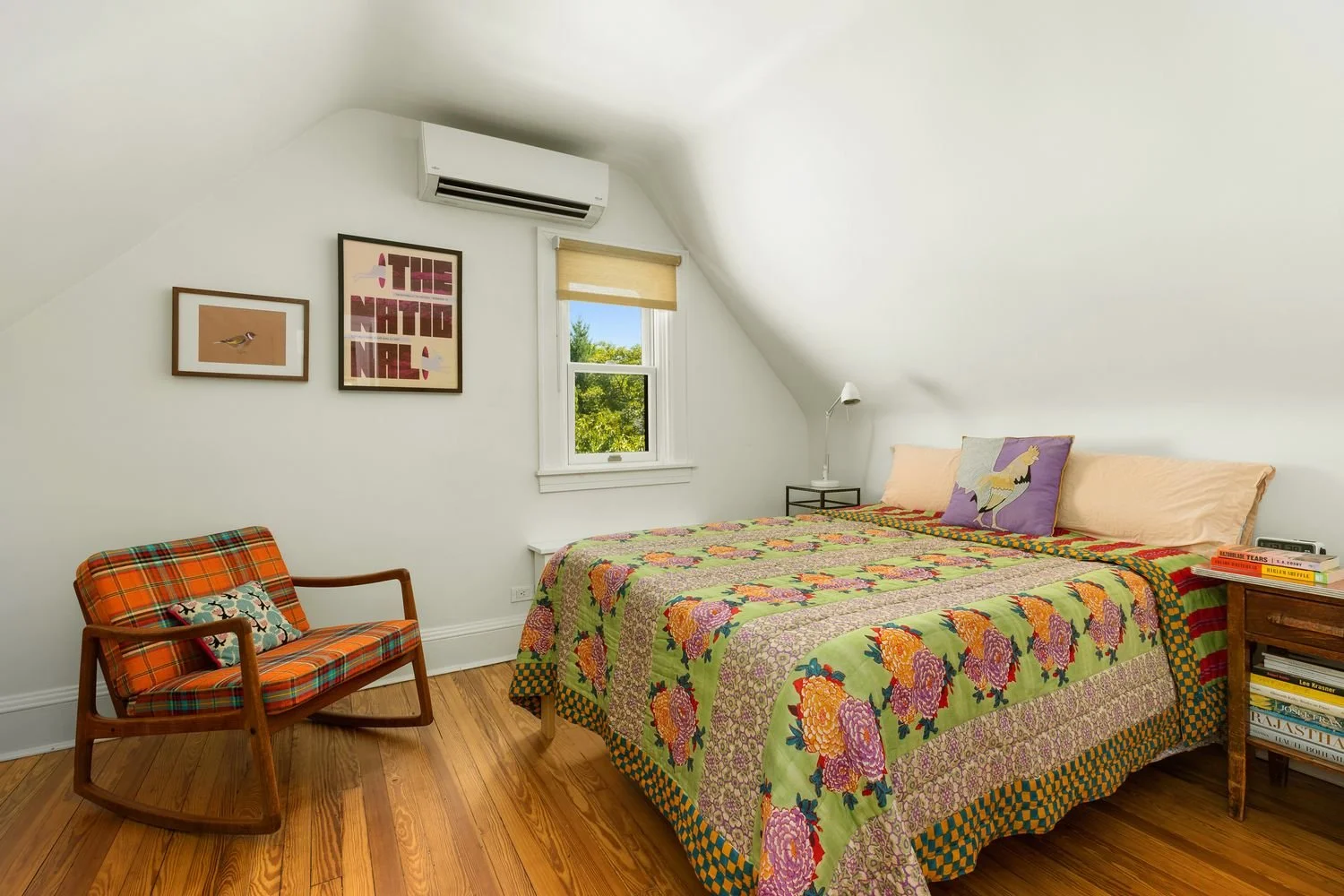 Together with architect Ole Sondresen, a complete gut renovation of a stand-alone Victorian home in Brooklyn built in 1910. Previous owners had lived in the space for more than 40 years and had not updated anything during that time. We were thrilled to find intact inlaid parquet flooring under multiple layers of carpeting that required minimal repair and restoration. The solid wood exterior and interior doors, handrails, balusters and newel posts of the stairs were covered with a lifetime of paint layers. We decided to strip and restore them to their original natural finish. We blew new recycled denim insulation into the walls. We replaced the roof first thing, to protect any new work we were doing inside. New windows and sliding doors were installed throughout the house. We crafted a new modern mantle with one 17-foot-long piece of salvaged white pine that spanned the width of the living room. The modern kitchen was crafted of custom milled white oak containing a hidden door for a full height pantry. Custom stained plywood panels and a white oak surround covered an affordable kitchen base design from Ikea. A bi-level bar design allowed for an open-plan approach that still partially concealed the working countertops inside the kitchen. Heated grey stone flooring and a canary yellow Bertazzoni range completed the warm, welcoming design. Moroccan mosaic and zellige tile, were combined with classic subway tile in the bathrooms. We used warm, natural cedar to cover the walls to create a spa-like environment with beautiful lighting from Roll and Hill. Furnishings are a mixture of locally sourced, vintage finds and new design custom upholstered pieces with splashes of vibrant wallpaper and textured grass cloth on the walls.